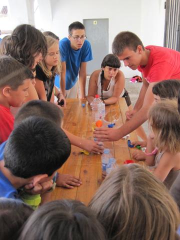 Després del temps lliure per al repòs o per als tornejos basquet i de parxís endrecem les habitacions, som a la meitat de la colònia i ja els feia falta. Després del berenar fem els tallers científics que dirigeix Oriol.